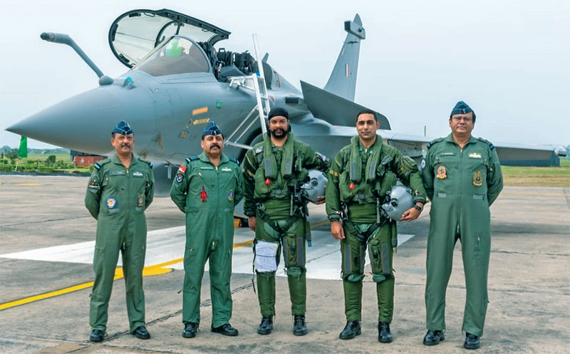 Air Marshal R.K.S Bhadauria posing with then AOC-in-C Western Air Command, Air Marshal B Suresh with the pilots of the first Rafale to arrive in India