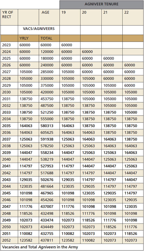 The Agniveers will serve for four years. Thereafter only 25 per cent will be retained.- During their tenure they will be entitled to a fixed monthly amount varying from Rs 30,000 in the first year to 45,000 in the fourth year. The present pay in the first year is approximately Rs 38,500 (includes Basic + DA + MSP). However, the take home will be Rs 21,000 (after forced savings of 30 per cent) in the first year and similar provision for later years. Similar amount (30 per cent) will be contributed by the government towards the savings and at the end of the tenure the outgoing Agniveers will be handed over an amount of Rs 11 lakh. The 25 per cent retained for regular service will not get anything apart from their forced savings.