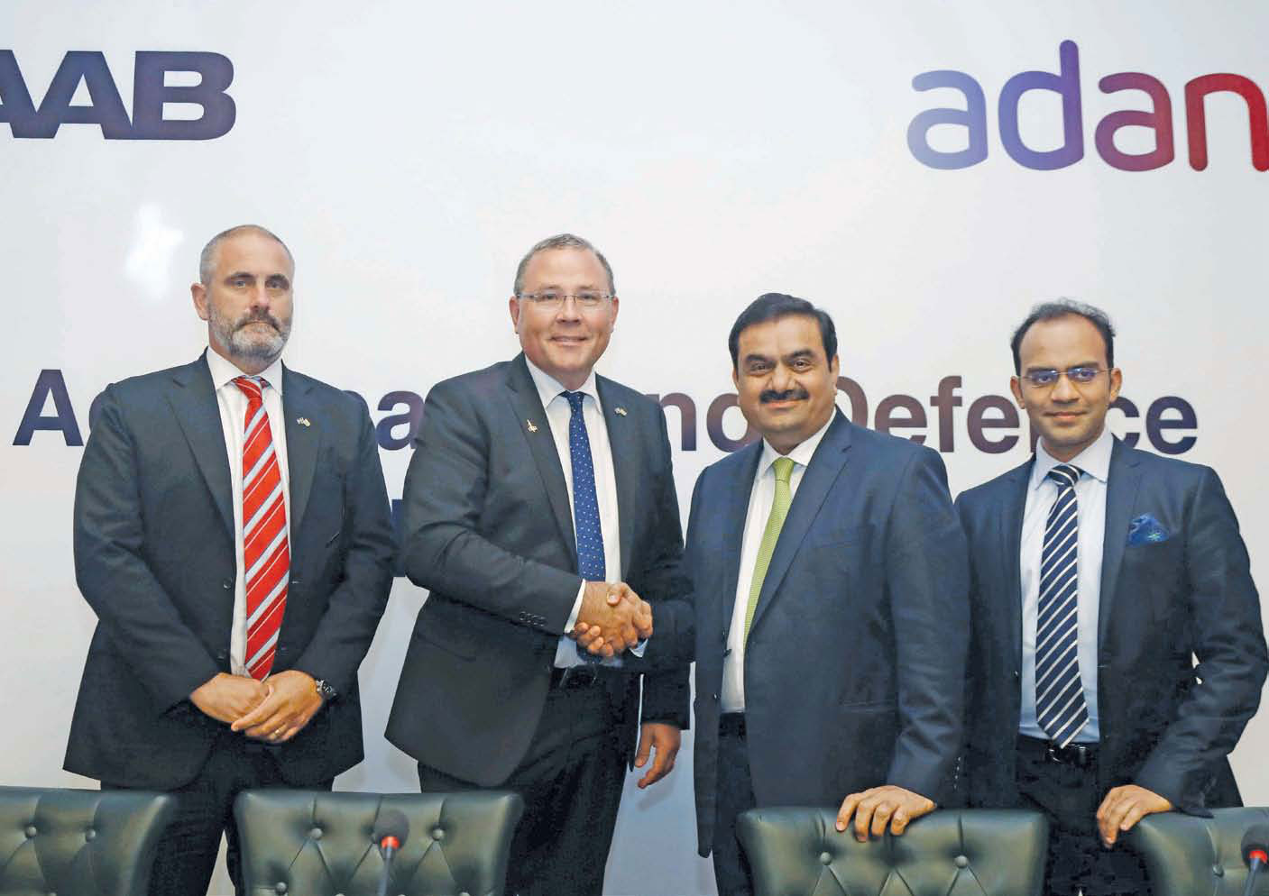 DEAL WITH DOUBTS President Saab Group Hakan Buskhe with Chairman Adani Group Gautam Adani