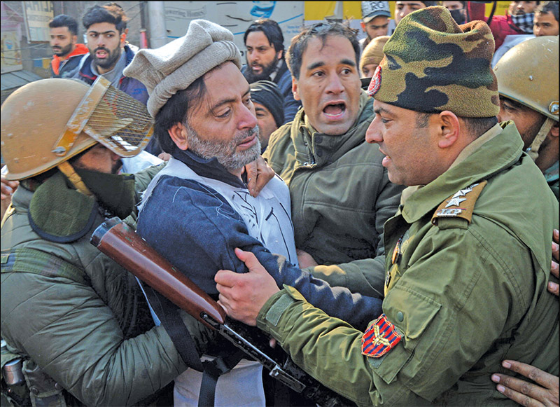 Police detaining Jammu and Kashmir Liberation Front (JKLF) chairman Muhammad Yasin Malik during a protest