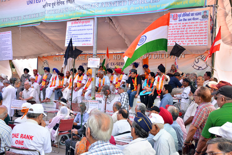 Ex-servicemen protesting for the early implementation of OROP at Jantar Mantar, Delhi