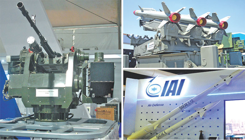 Clockwise from above OFB 12.7mm RCWS; Akash-1 E-SHORADS; Barak-8 MR-SAM & Barak-8ER LR-SAM