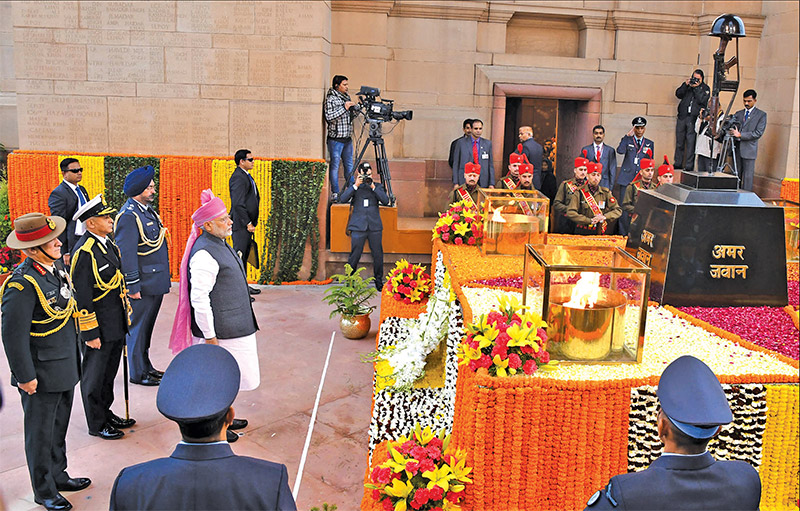 Prime Minister Narendra Modi with the three Service Chiefs at the Amar Jawan Jyoti
