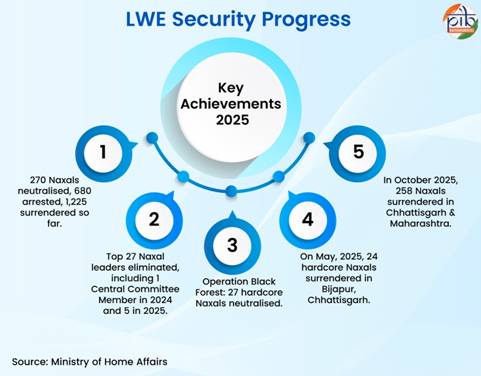 In 2025 alone, security forces neutralised 270 Naxals, arrested 680, and facilitated 1,225 surrenders. Major operations such as Operation Black Forest and mass surrenders in Bijapur (Chhattisgarh) and Maharashtra underline growing confidence among insurgents to rejoin mainstream life.