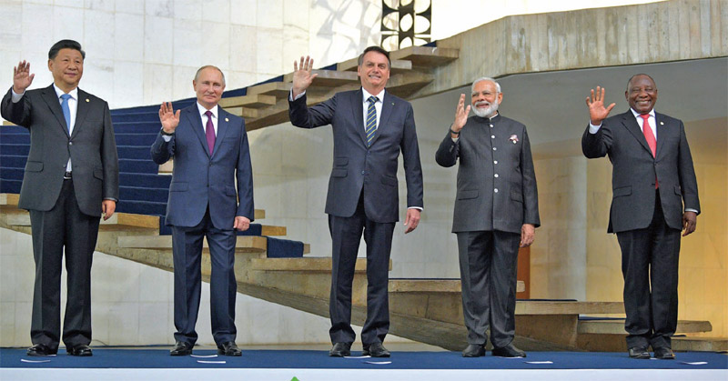 Chinese President Xi Jinping, Russian President Vladimir Putin, Brazilian President Jair Bolsonaro, Indian Prime Minister Narendra Modi, and South African President Cyril Ramaphosa