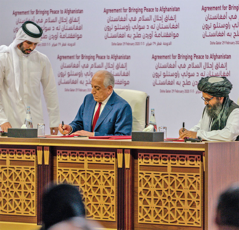 US representative Zalmay Khalilzad (left) and Taliban representative Abdul Ghani Baradar (right) sign the agreement in Doha,