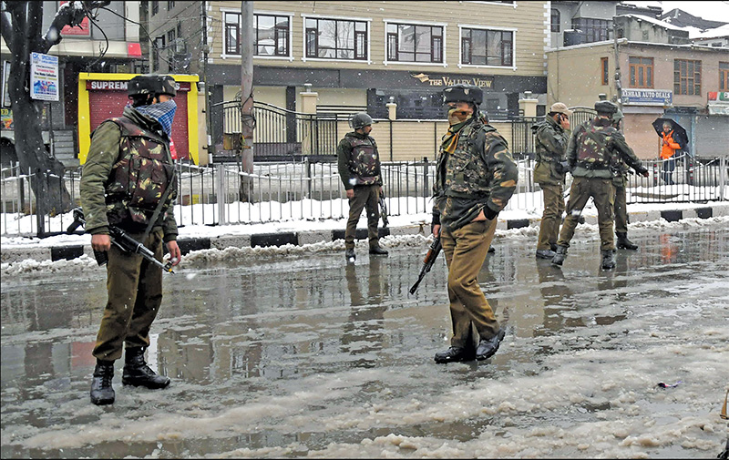 Paramilitary soldiers arrive near an encounter site in Karan Nagar where two militants had opened fire