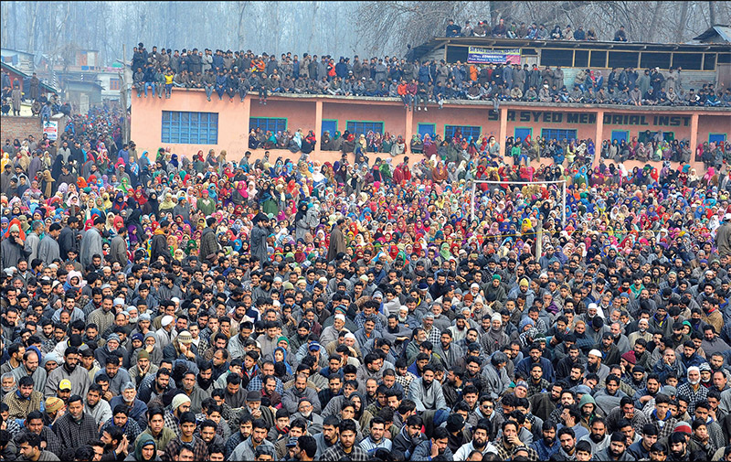 Kashmiri villagers at the funeral prayers of the local militant that gunned down Shujaat Bukhari